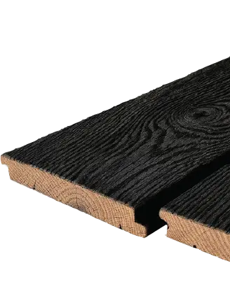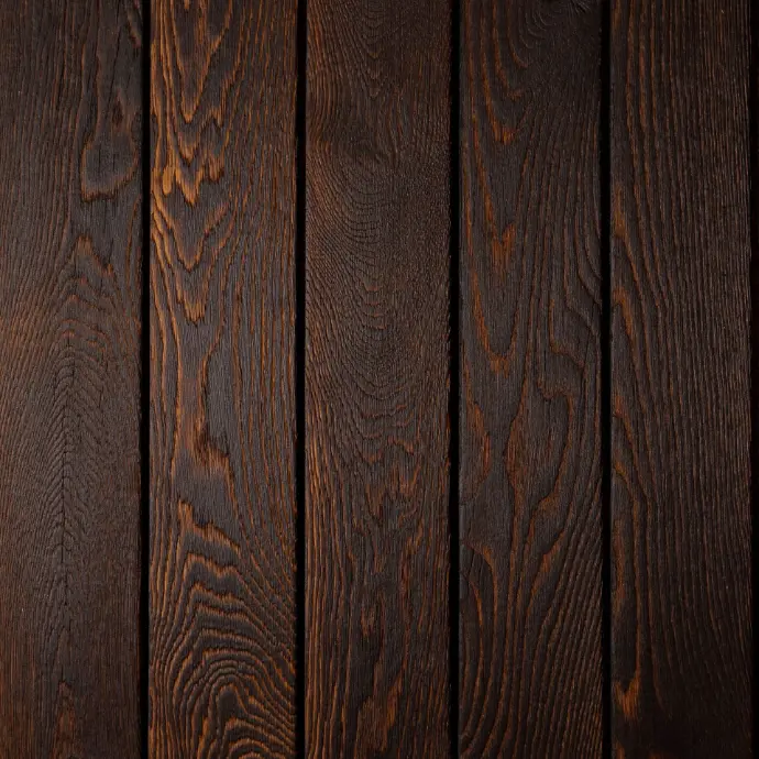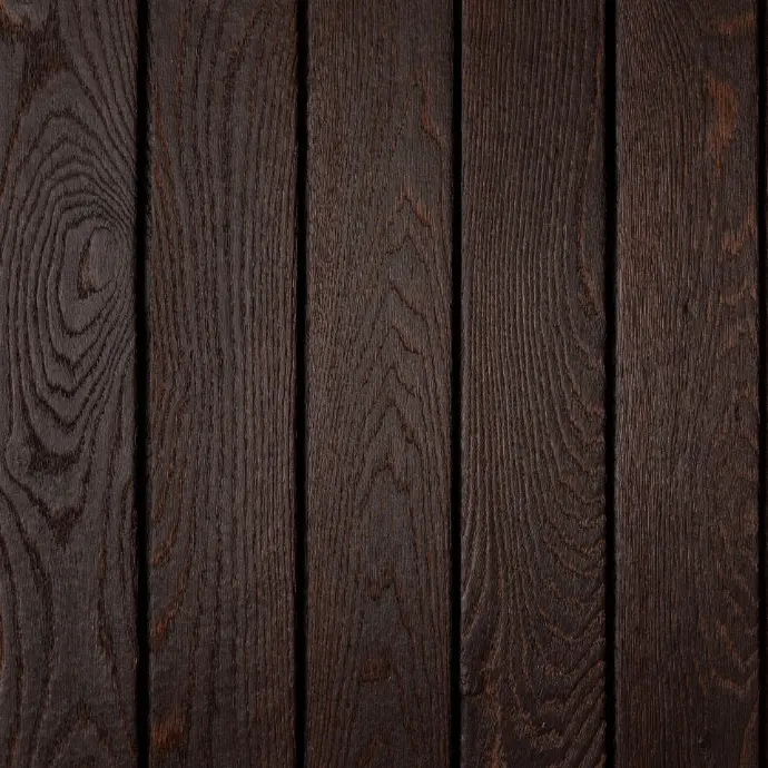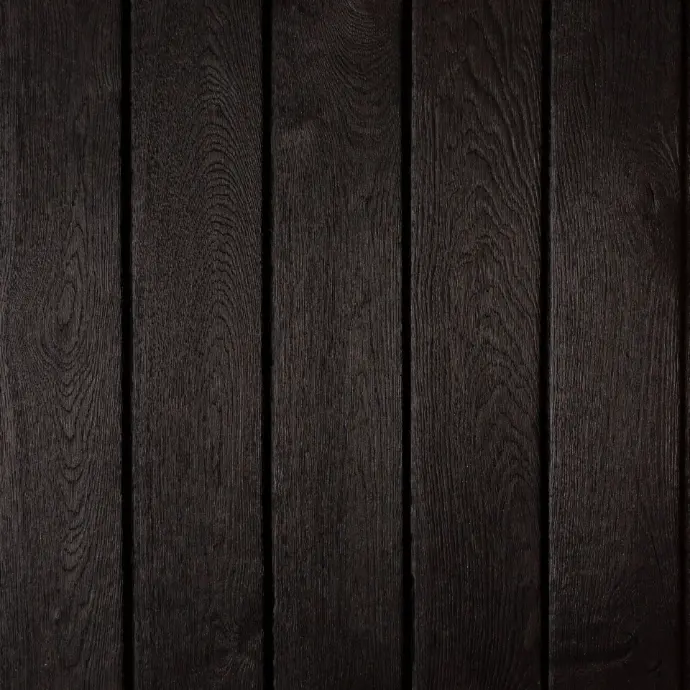 Ember Oak is created from mixed grades of our European oak, typically featuring small to medium-sized knots that appear fairly regularly, creating a light characterful finish. Due to its tight grain, it brushes differently from most other species, accentuating the grain direction while creating a flatter surface and texture compared to larch. The charring process turns the timber deep blacks and browns, which can slightly camouflage the knots. | 14-22% | 650-850 kg/m3 | Class 2 / 3: Durable/ Moderately Durable | Medium | Stainless Steel |